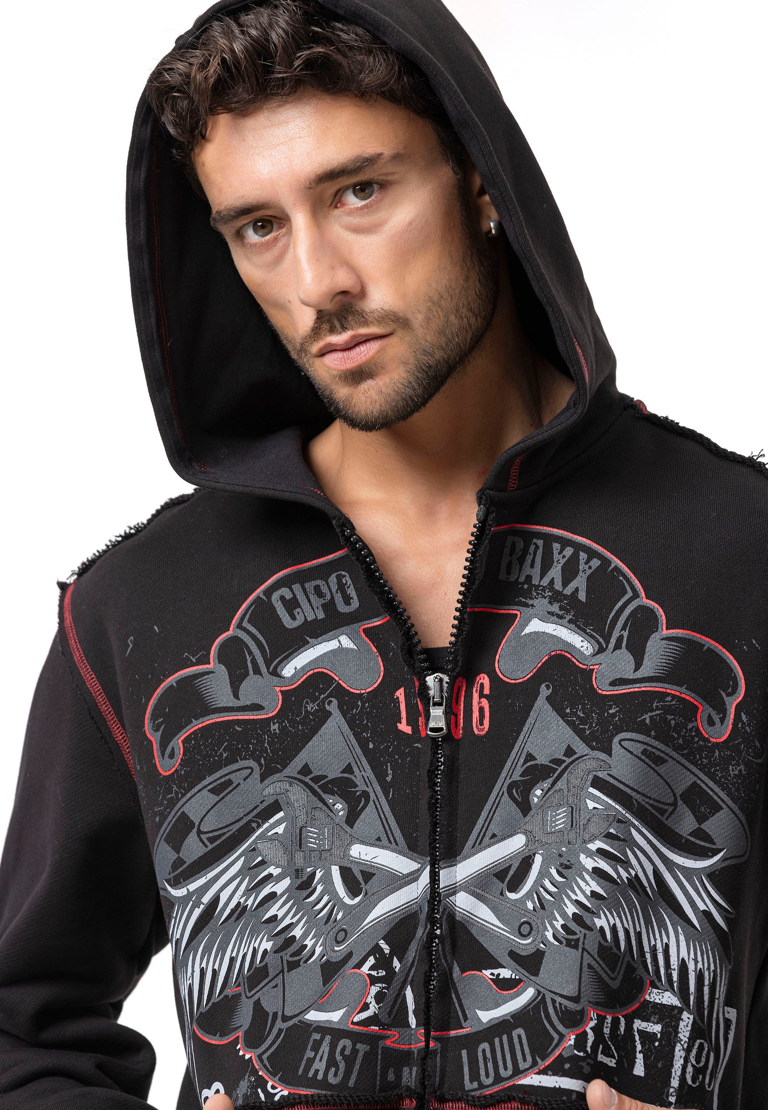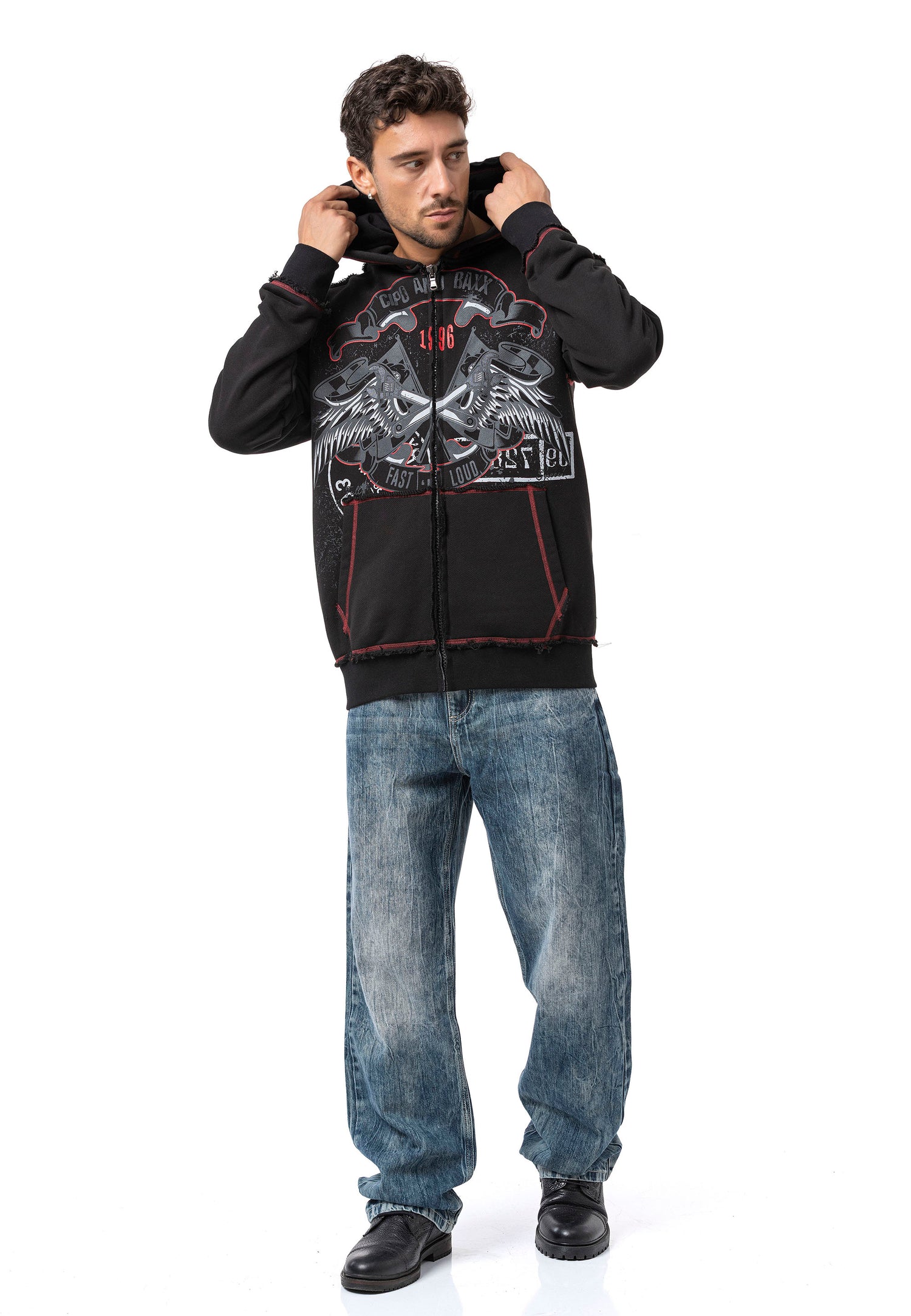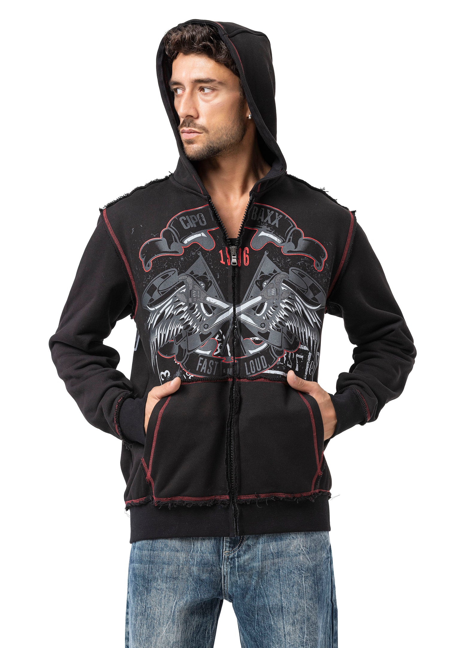 The CL598 Men’s hooded sweatshirt jacket is a true statement for men with character. The striking front print with two eagles, combined with the lettering “CHROME BLACK – FAST AND LOUD – 1969,” gives the jacket a rebellious, rock-inspired look. The red contrast stitching, practical front pockets, and hood with drawstring provide functionality and comfort – ideal for cool days, festivals, or urban outfits.