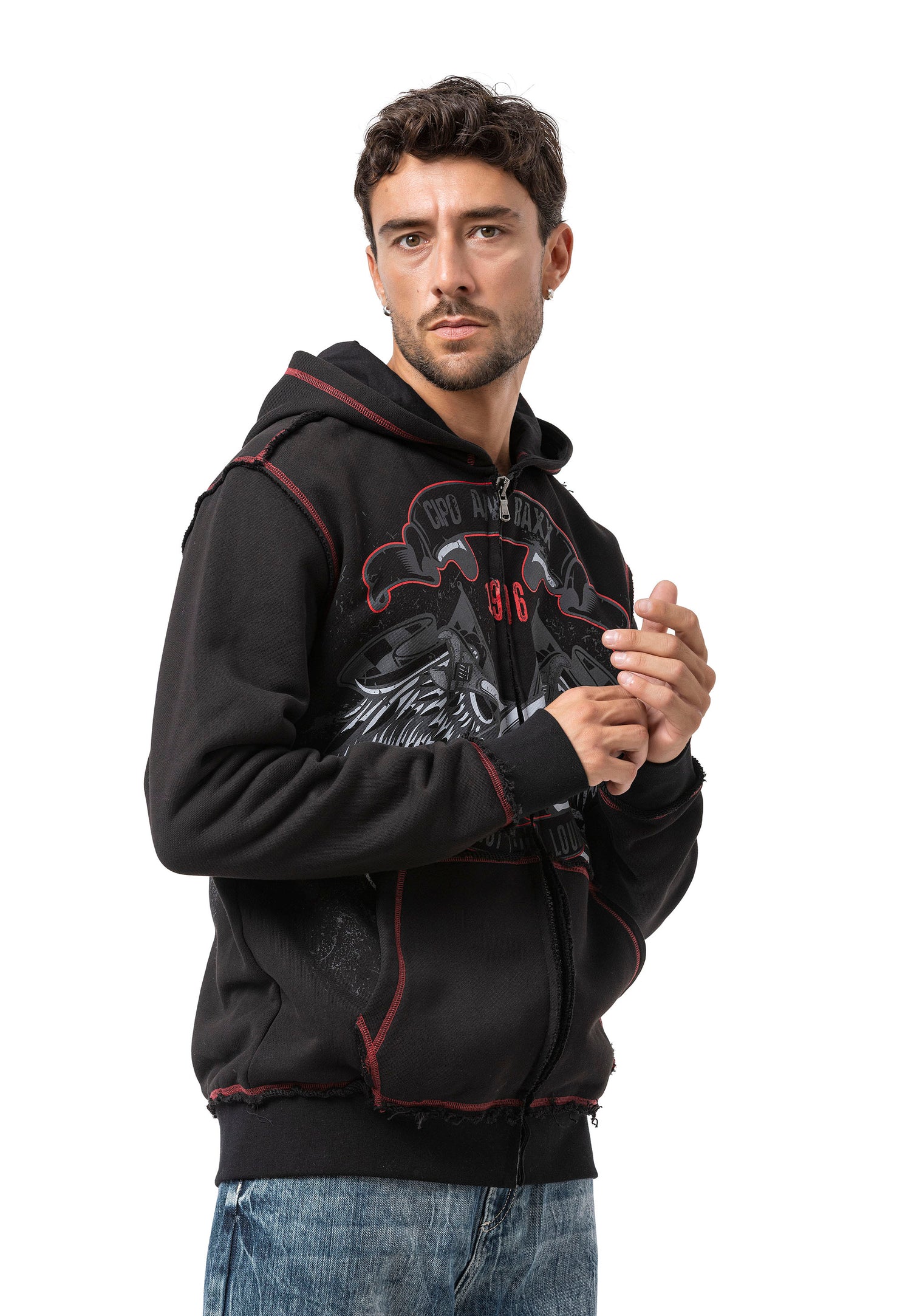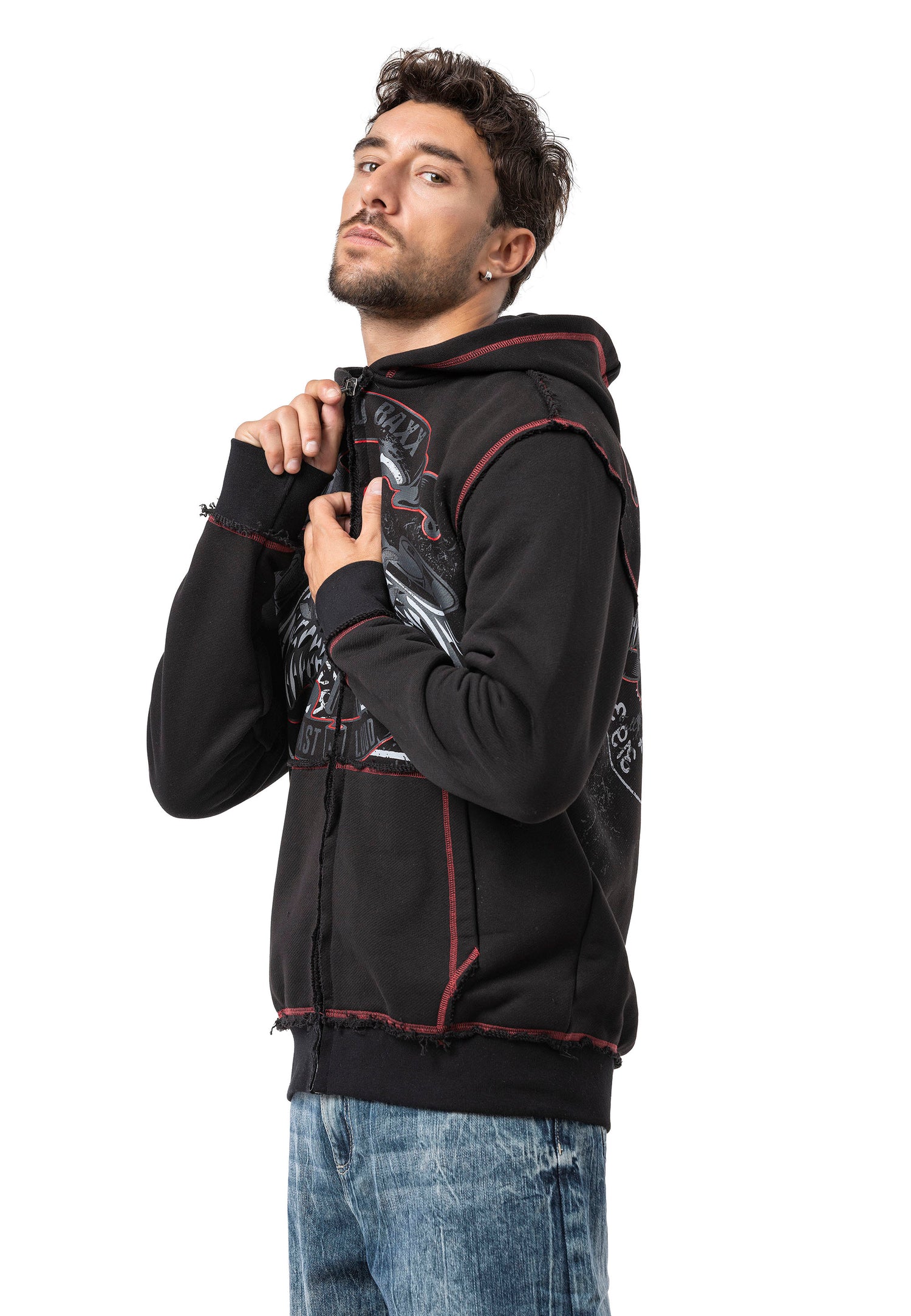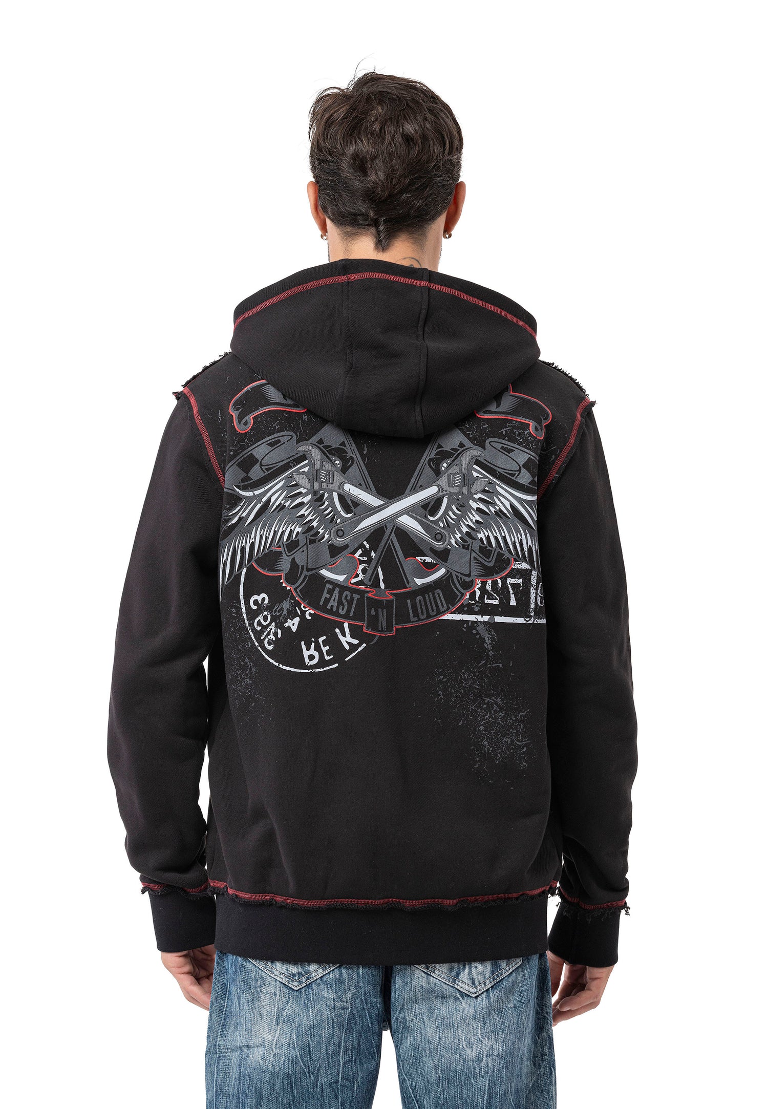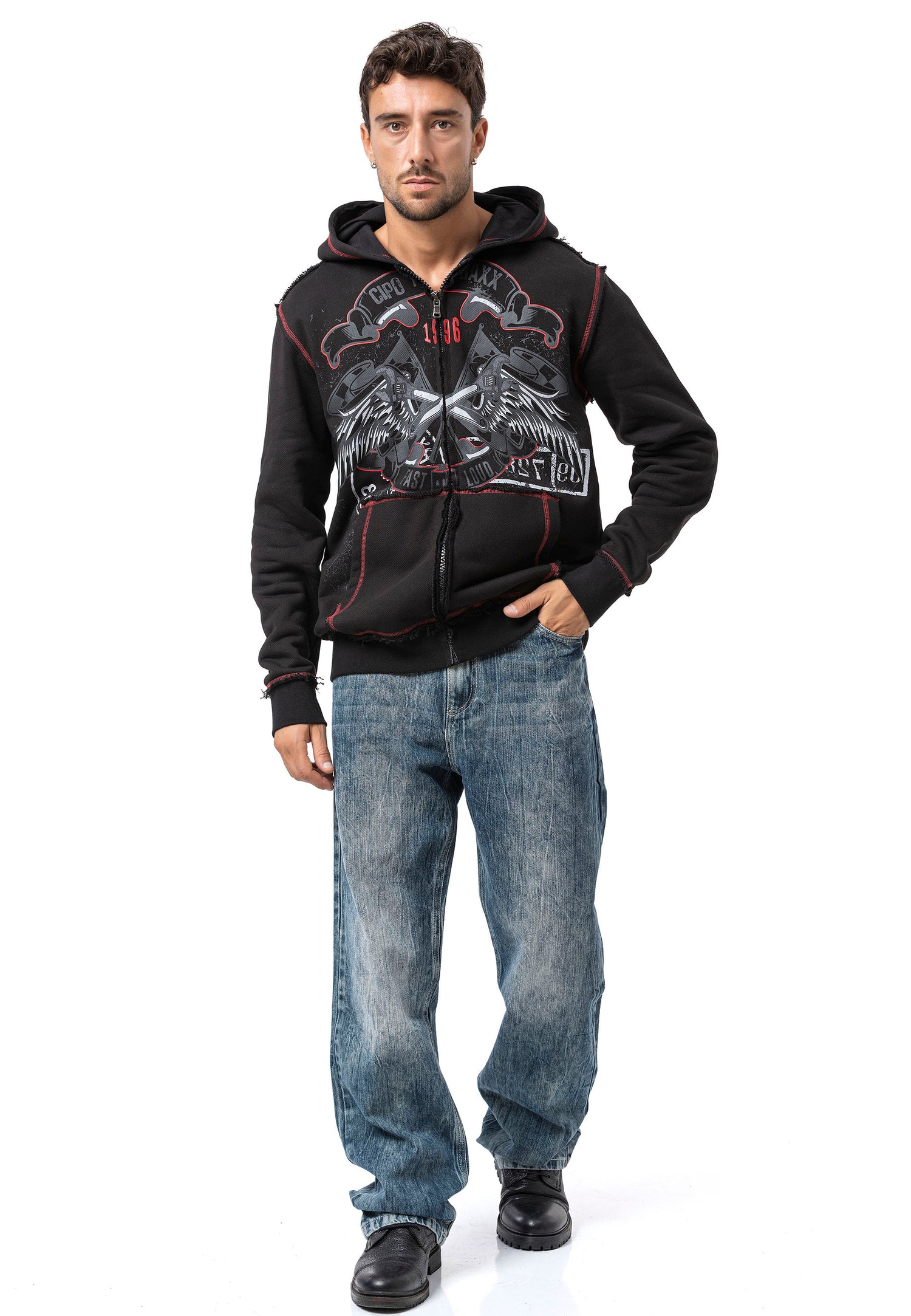 The CL598 Men’s hooded sweatshirt jacket is a true statement for men with character. The striking front print with two eagles, combined with the lettering “CHROME BLACK – FAST AND LOUD – 1969,” gives the jacket a rebellious, rock-inspired look. The red contrast stitching, practical front pockets, and hood with drawstring provide functionality and comfort – ideal for cool days, festivals, or urban outfits.