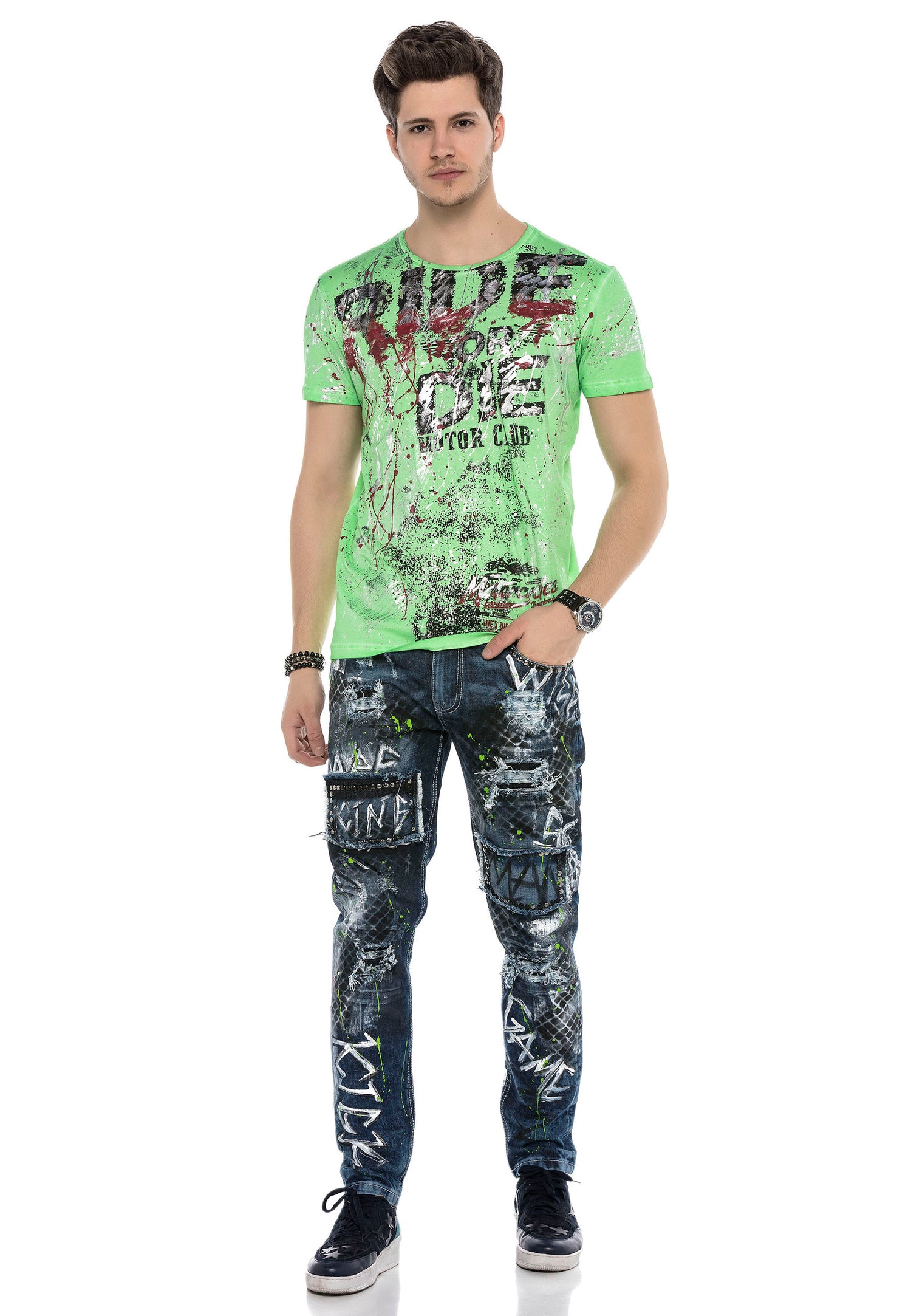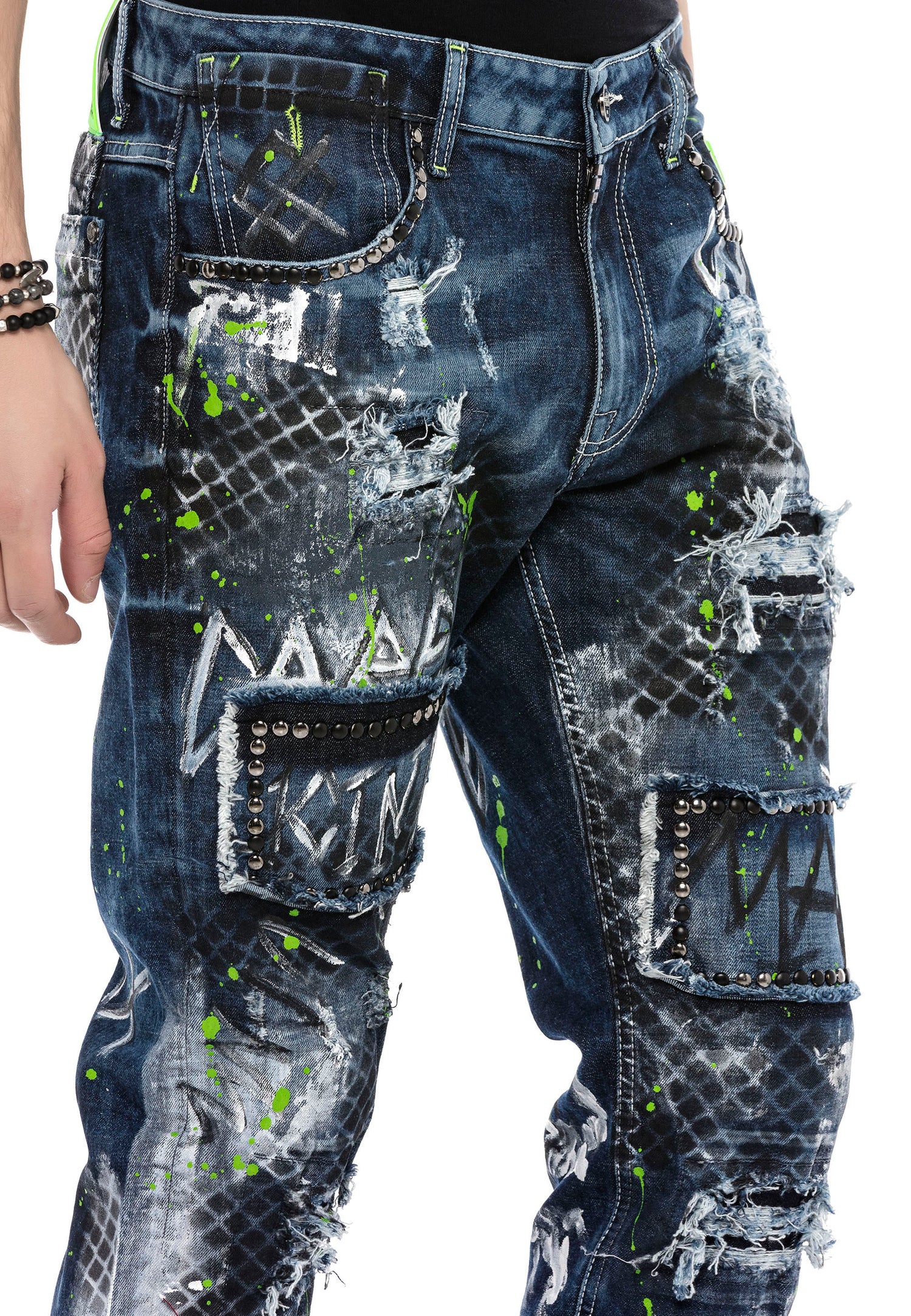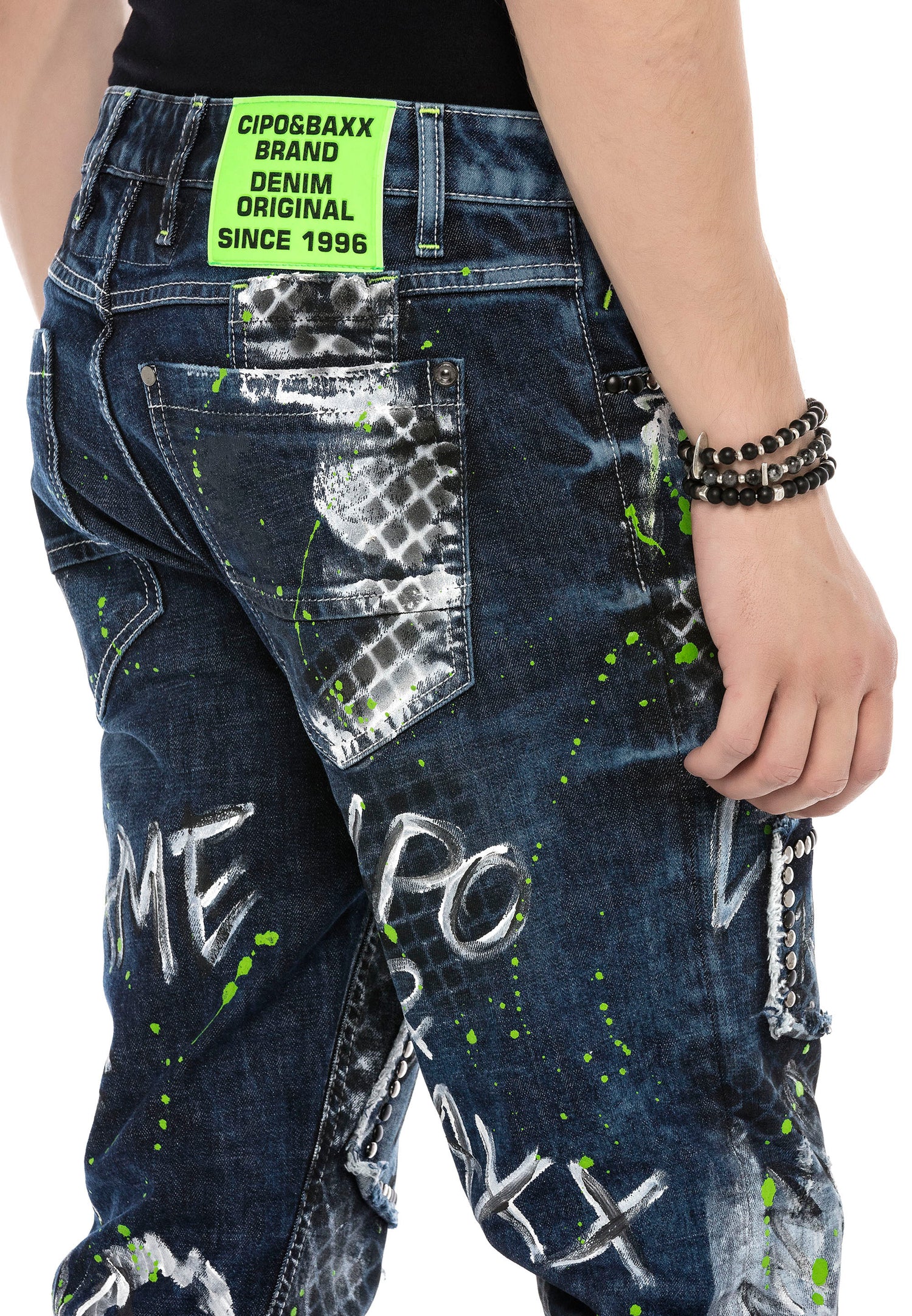 Te modne jeansy o prostym kroju marki Cipo & Baxx dla mężczyzn mają świetny krój, dzięki czemu idealnie pasują na każdą okazję. Dżinsy są również imponujące wizualnie i przyciągają wzrok, niezależnie od tego, z czym są połączone. Naszywki, kolorowe plamy i nity na nogawkach są prawdziwymi atrakcjami.