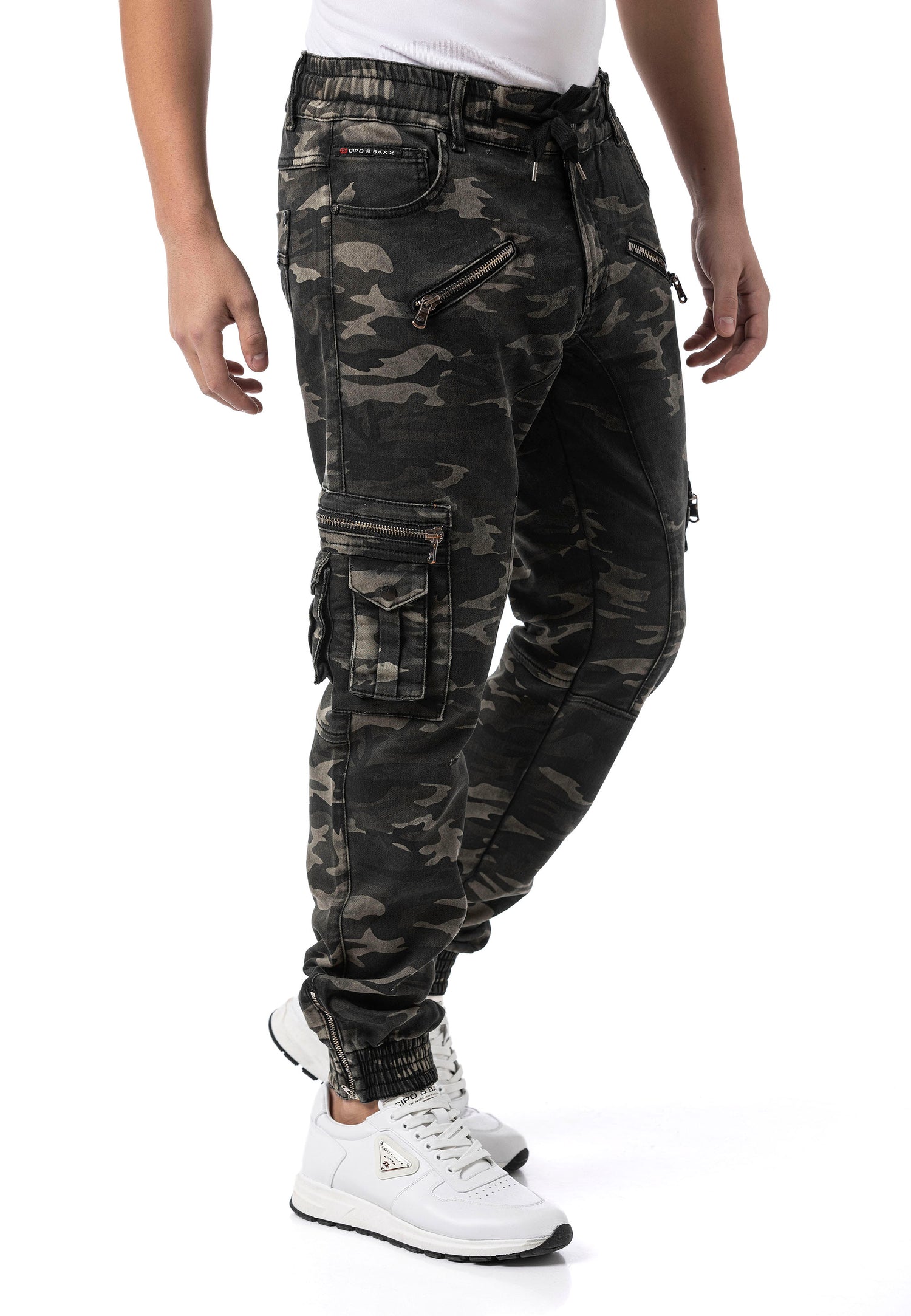 CD908 Męskie Spodnie Jogger Cargo w Kamuflażu z Zamkami i Wieloma Kieszeniami - KAMUFLAŻ / W29-L32 nie jest w magazynie i zostanie wysłany, gdy tylko będzie ponownie dostępny