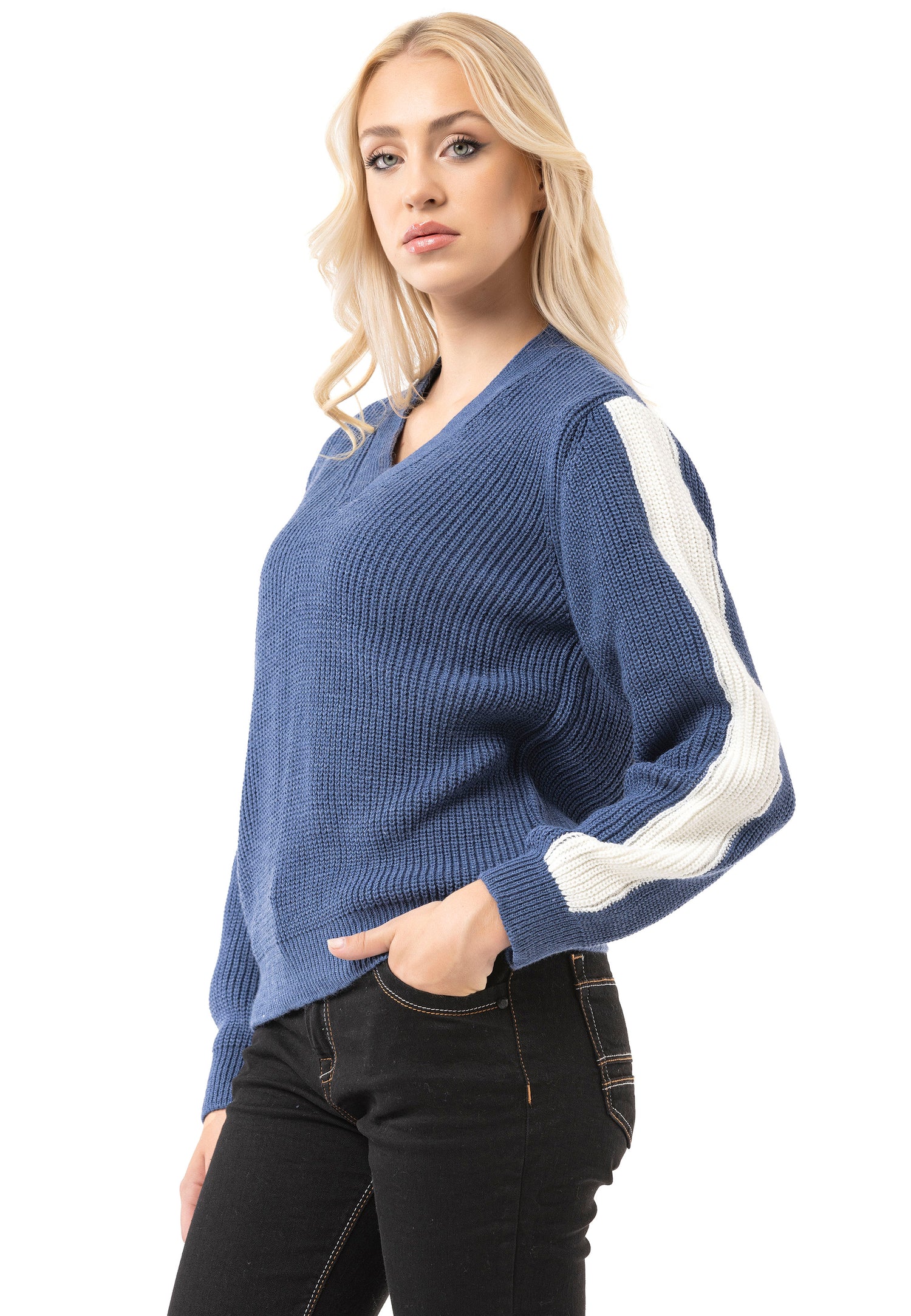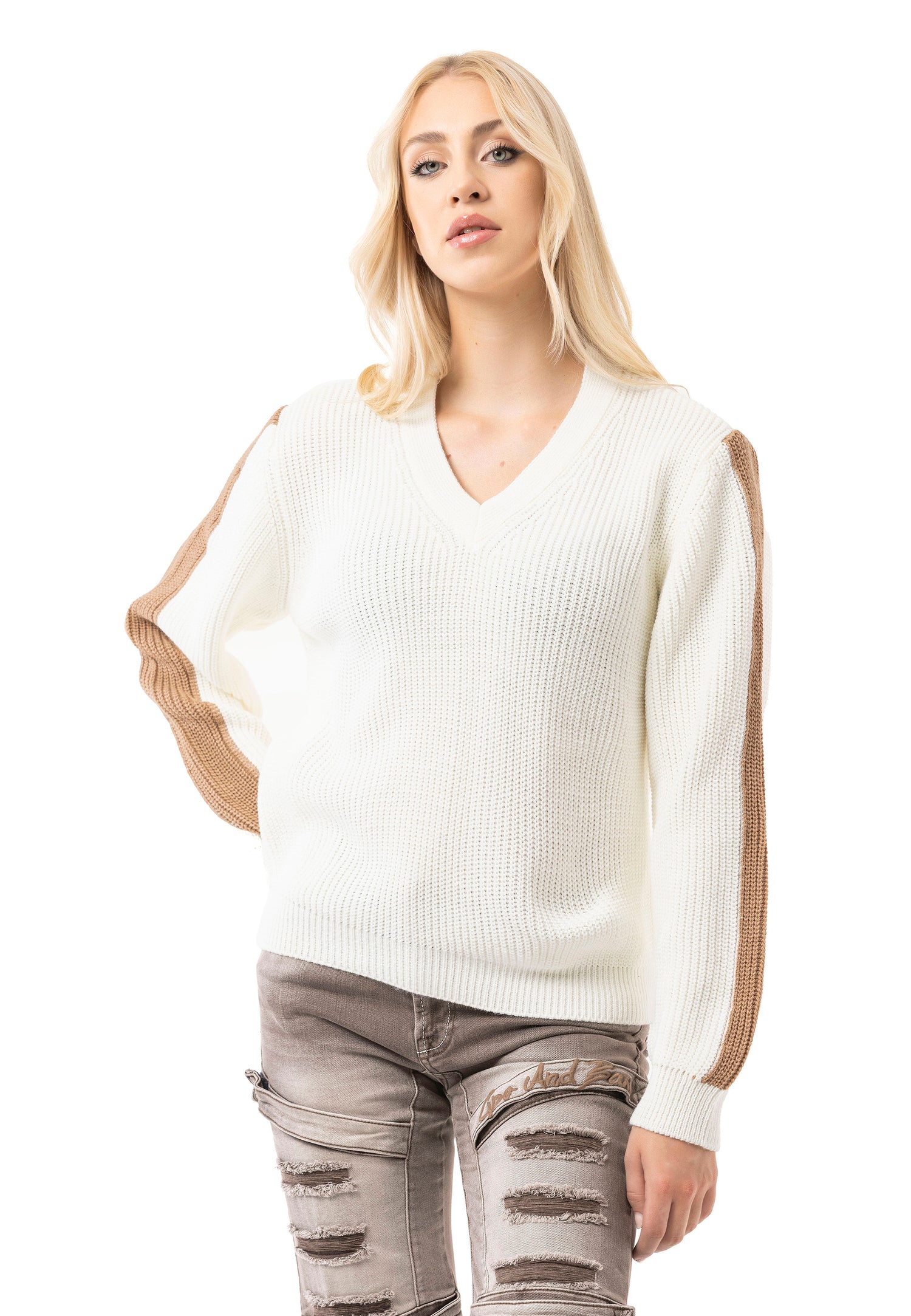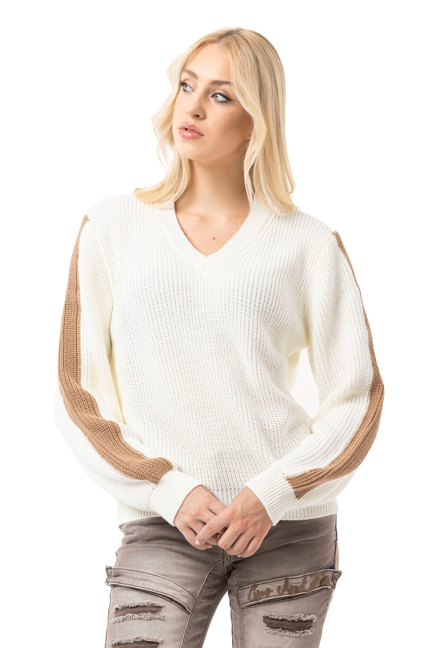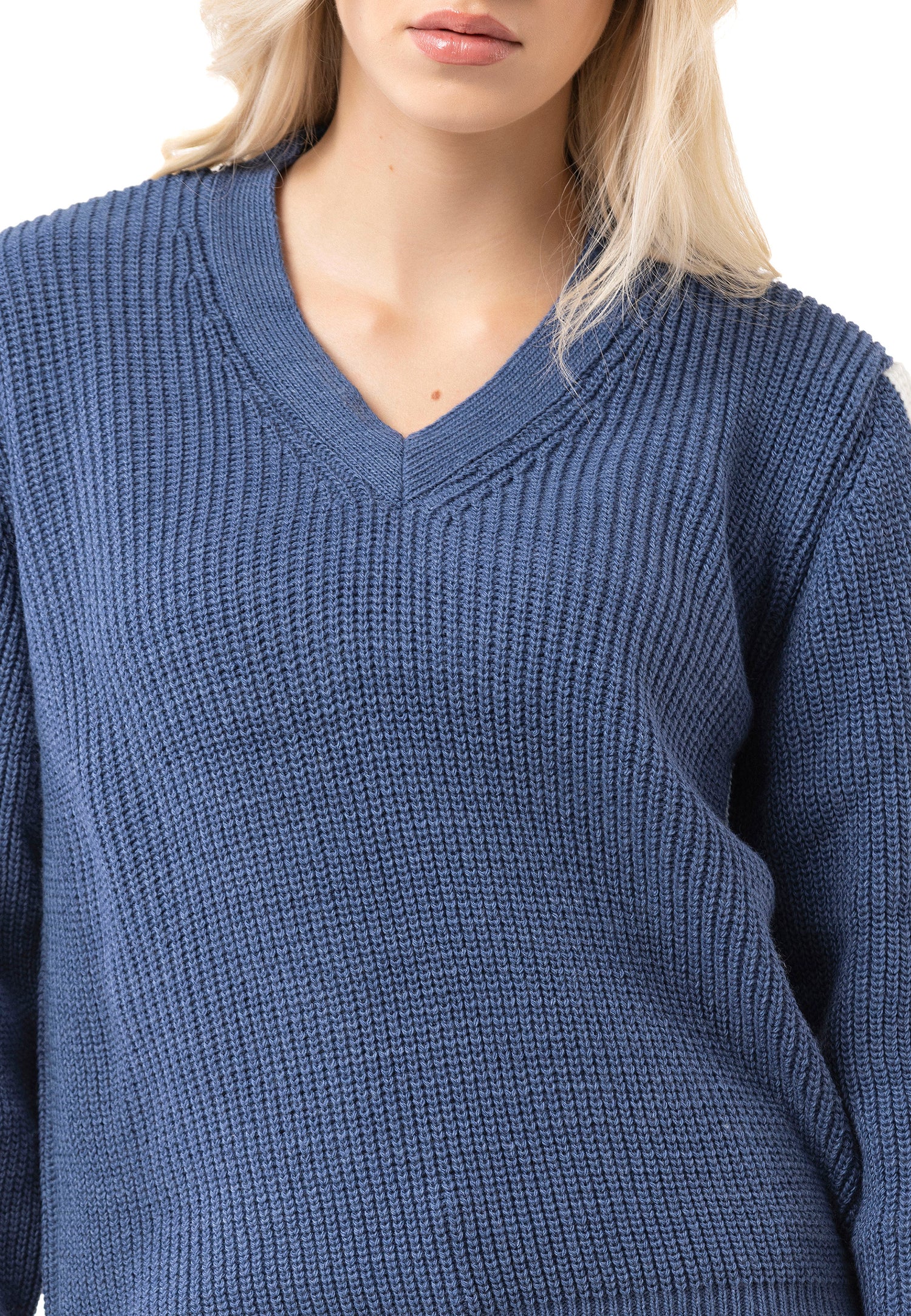 * ✔️ Design: dekolt w kształcie litery V, prążkowana struktura, paski na rękawach
