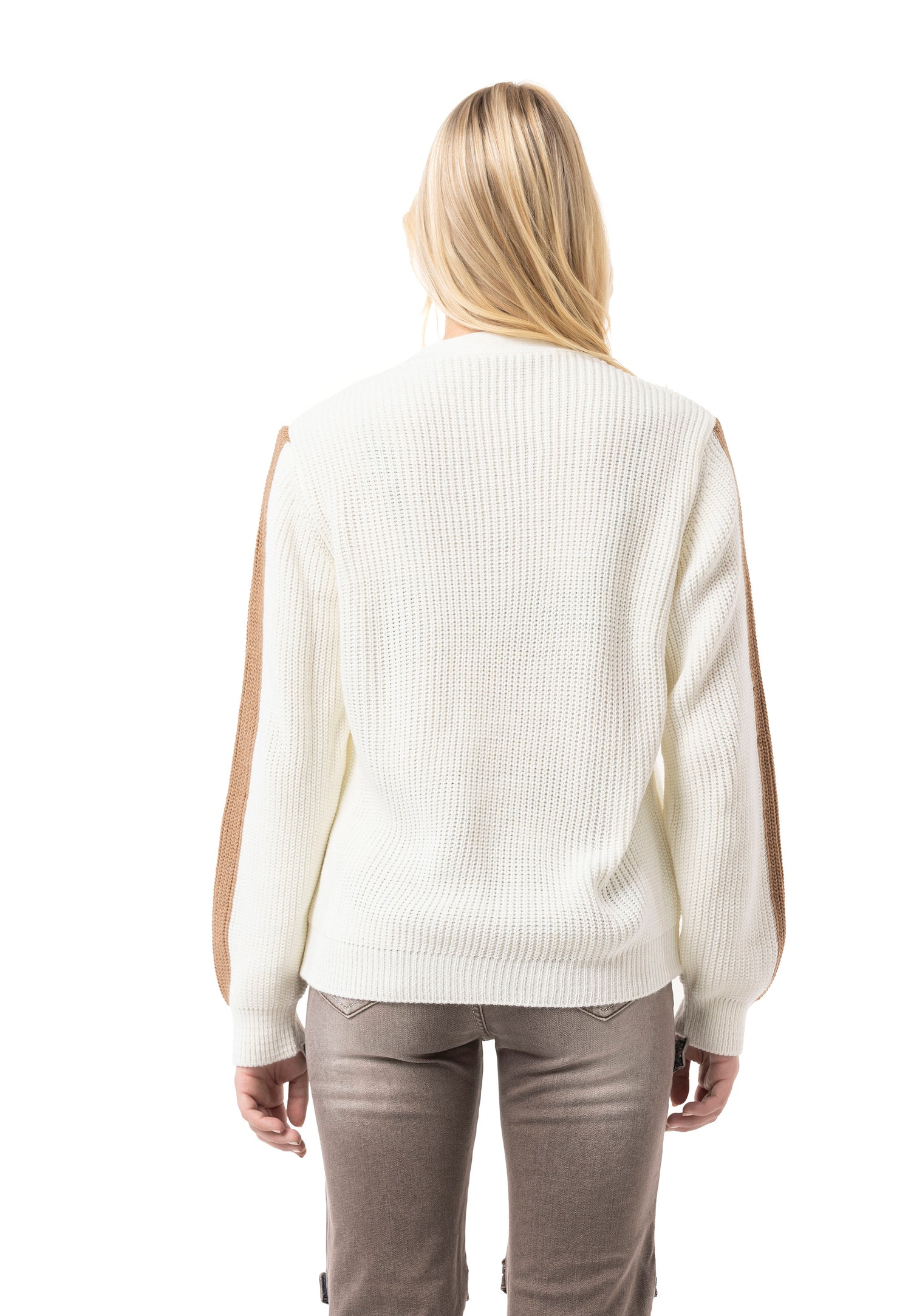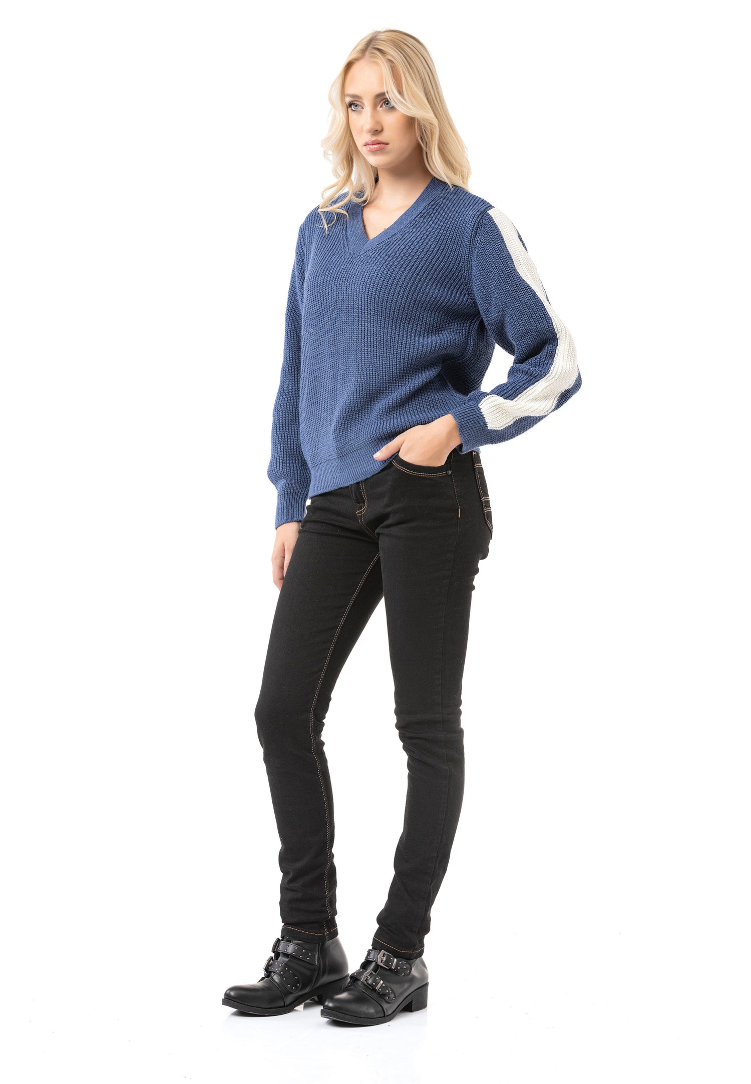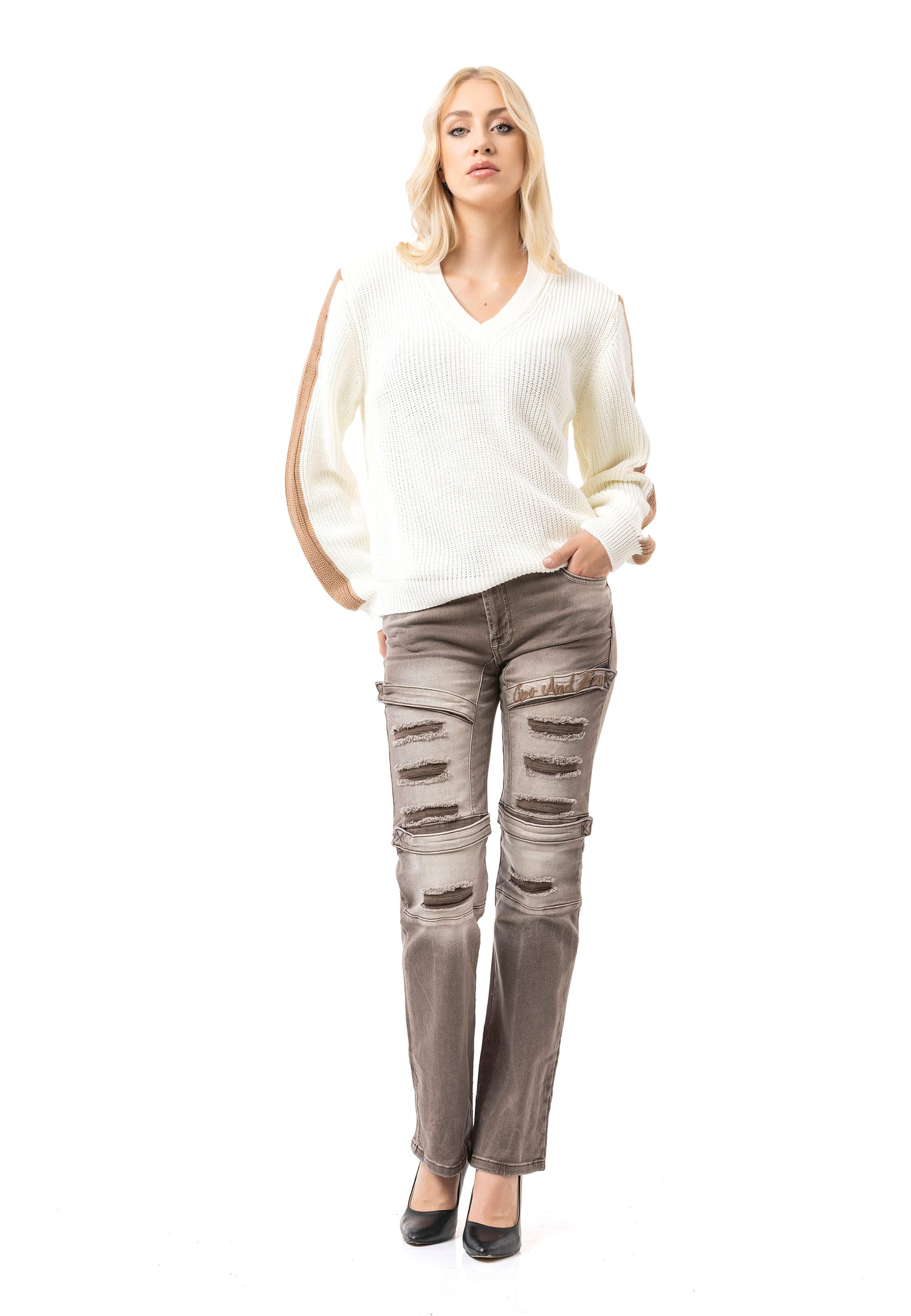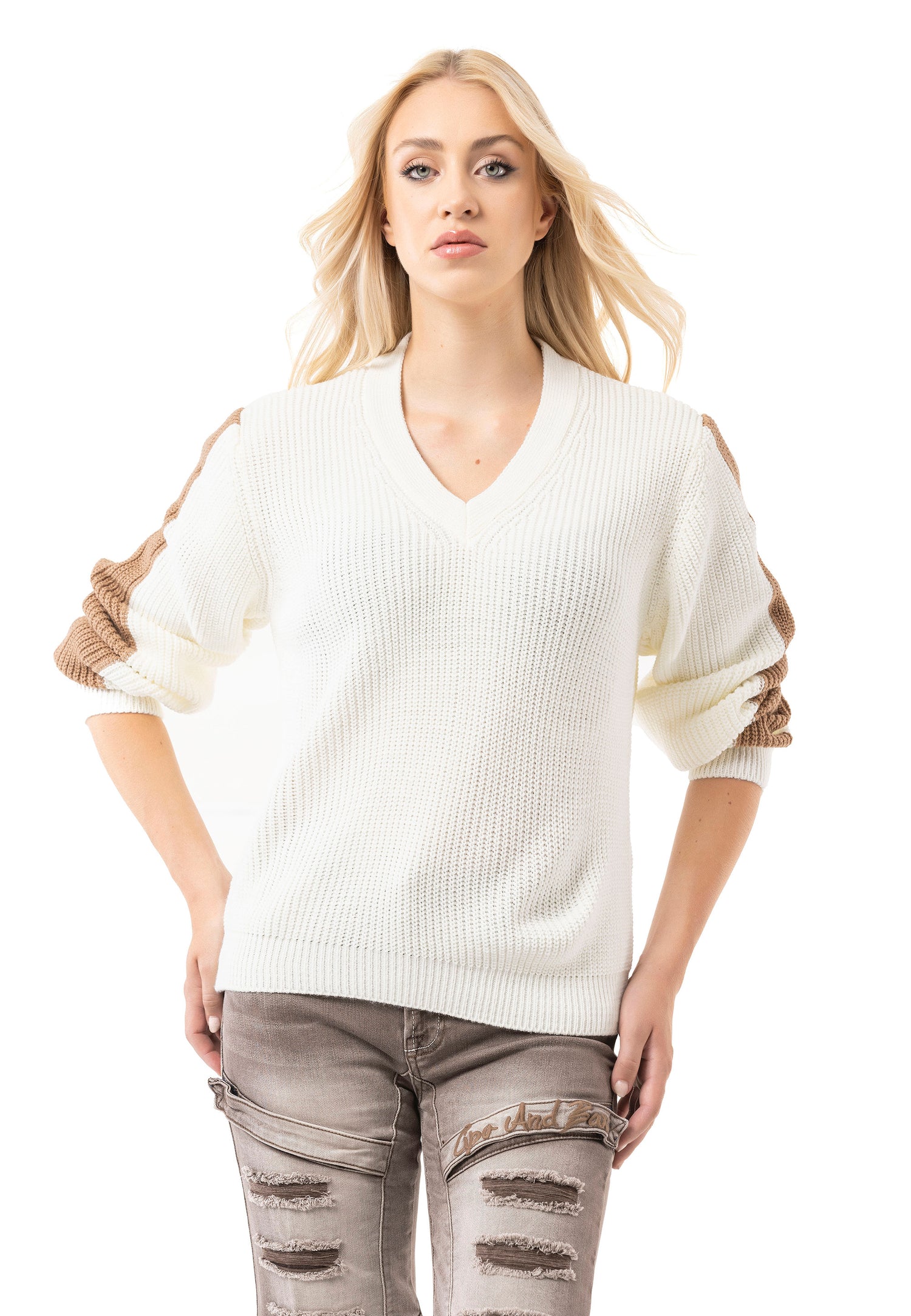 * ✔️ Design: dekolt w kształcie litery V, prążkowana struktura, paski na rękawach