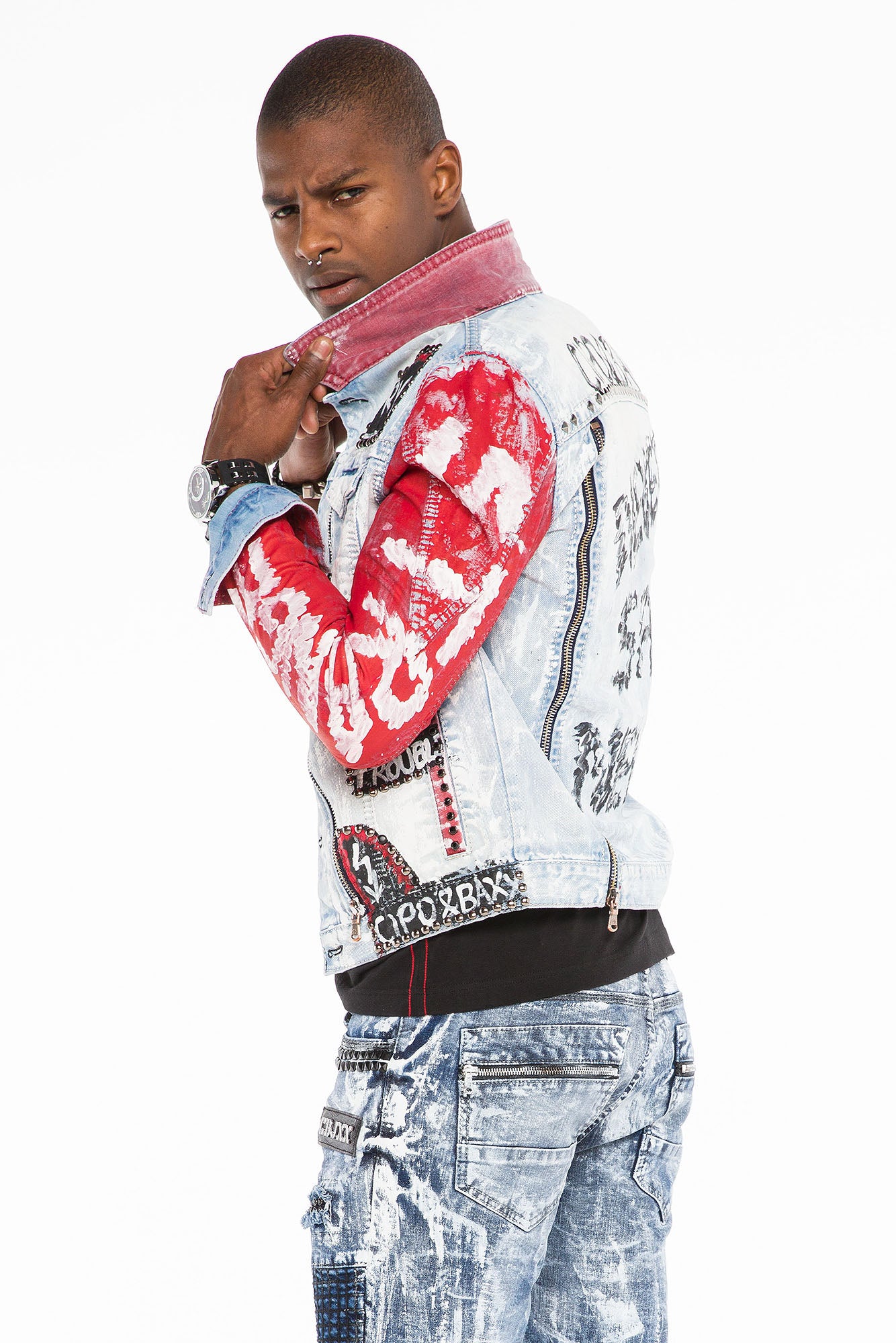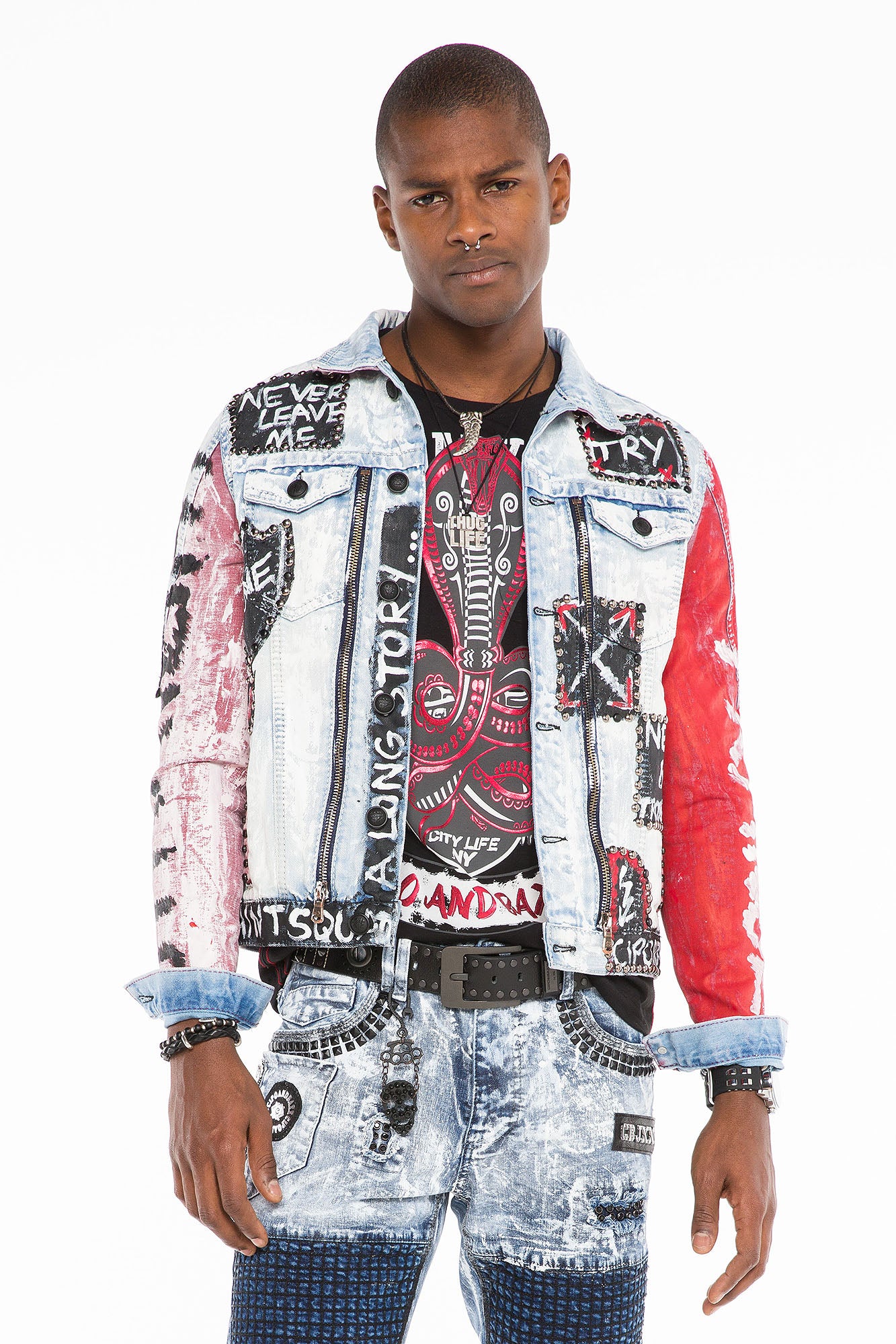 Cipo & Baxx presenteert hier een uniek, handgemaakt spijkerjack dat opvalt door veel details. Overal op het model zijn zwarte klinknagels en sierstenen te vinden, evenals ritsen en met de hand aangebrachte witte letters. Onderscheid u van de massa, want elk stuk is volledig uniek!